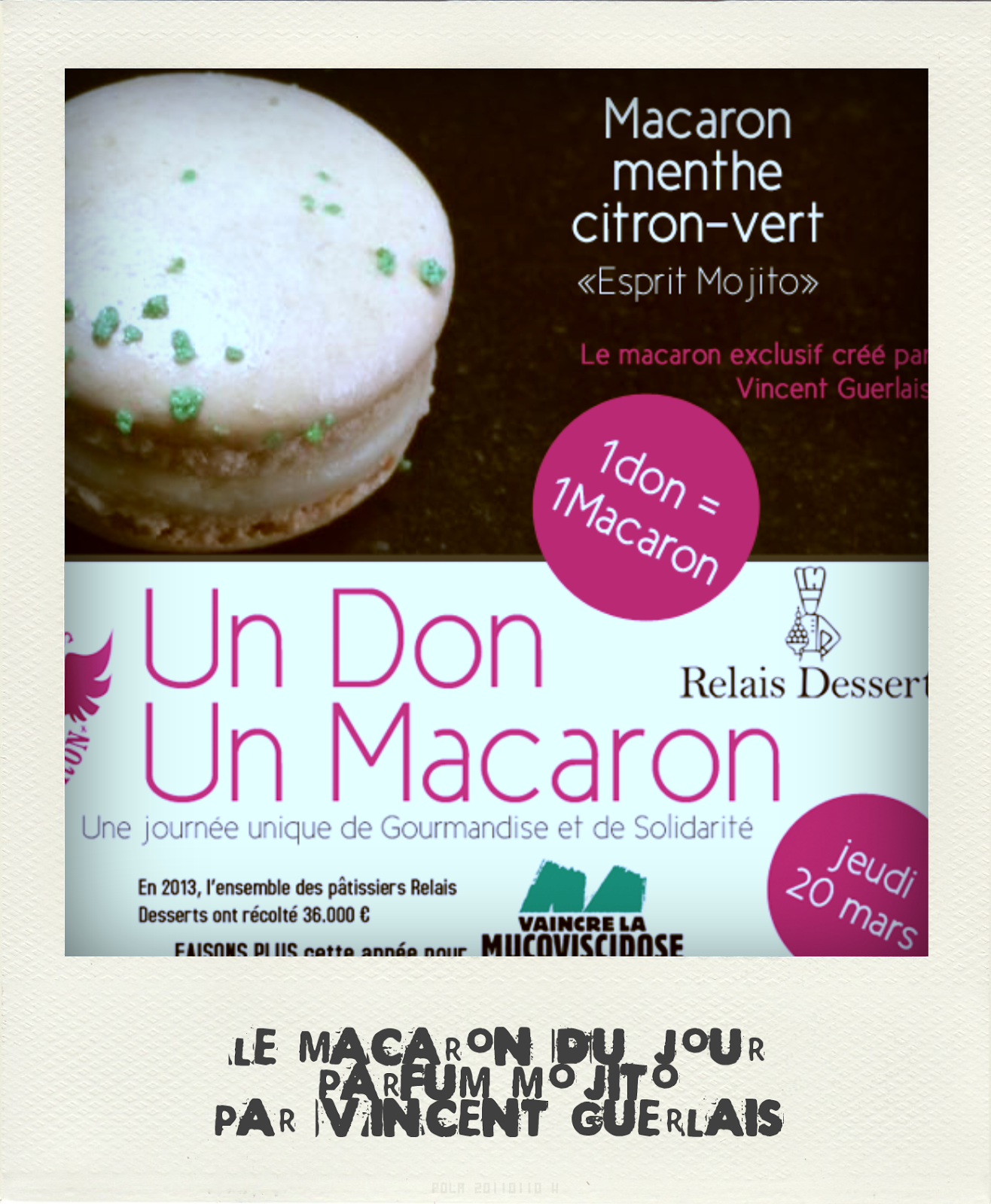 Les boutiques Vincent Guerlais s’associe à l’opération 1 don = 1 macaron, et proposent pour l’occasion un macaron menthe/citron vert, l’autre façon de déguster un mojito 🙂
